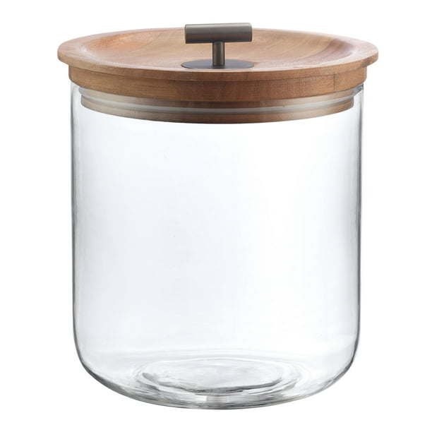 Includes silver metal tongs, clear glass bucket, and natural wood lid that comes with handle