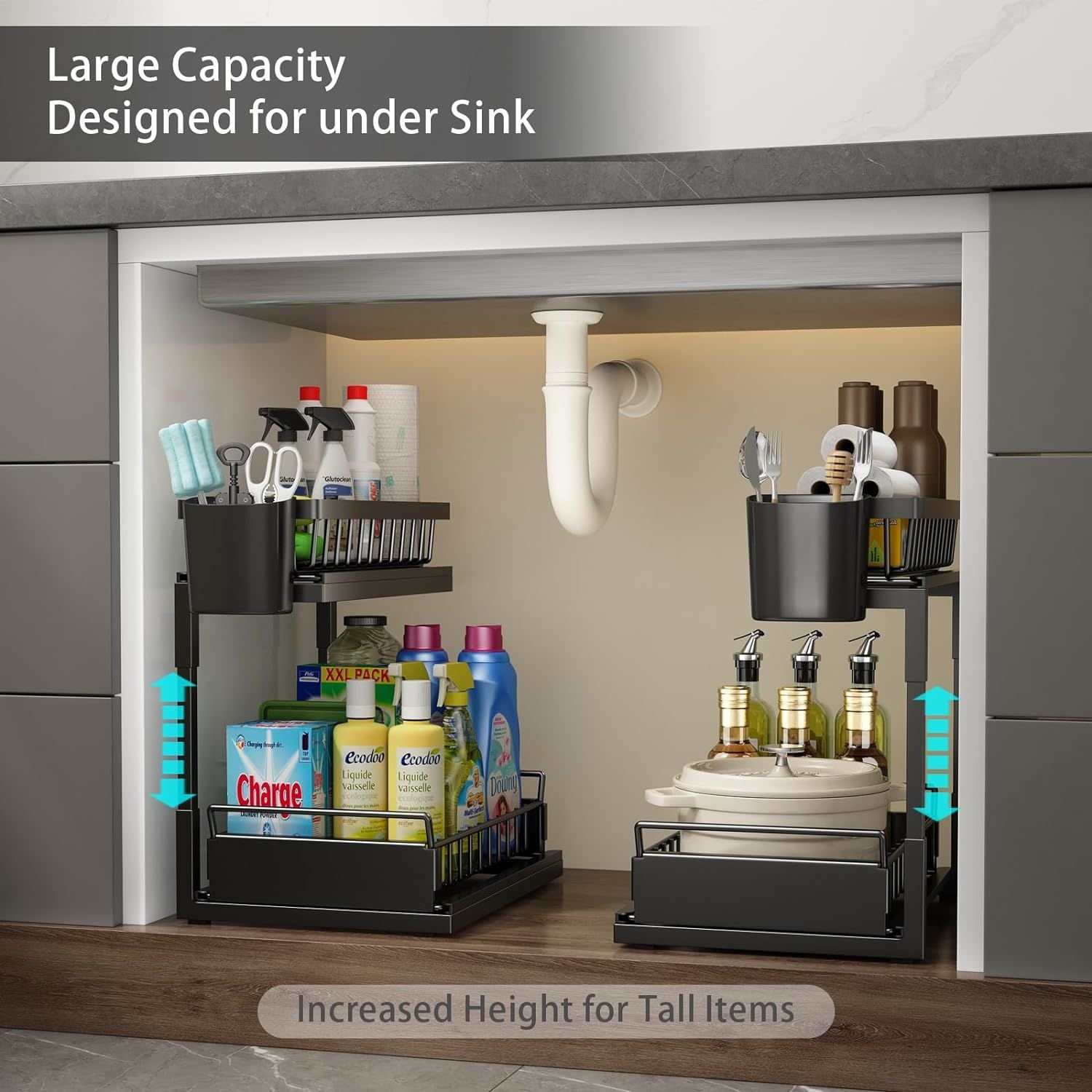 1.A Double Delight: This 2-tier under sink organizer is designed to take full advantage of the vertical space under your sink. With two sliding drawers, you have double the storage for all your essentials, from cleaning supplies to toiletries.