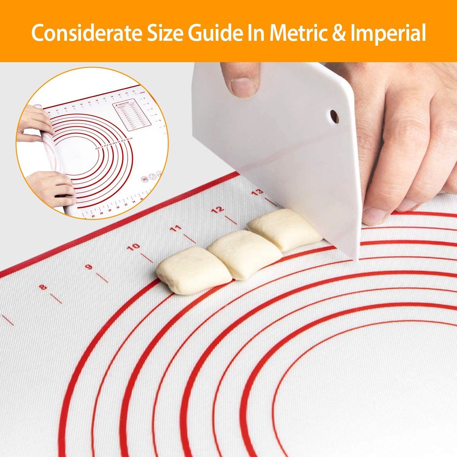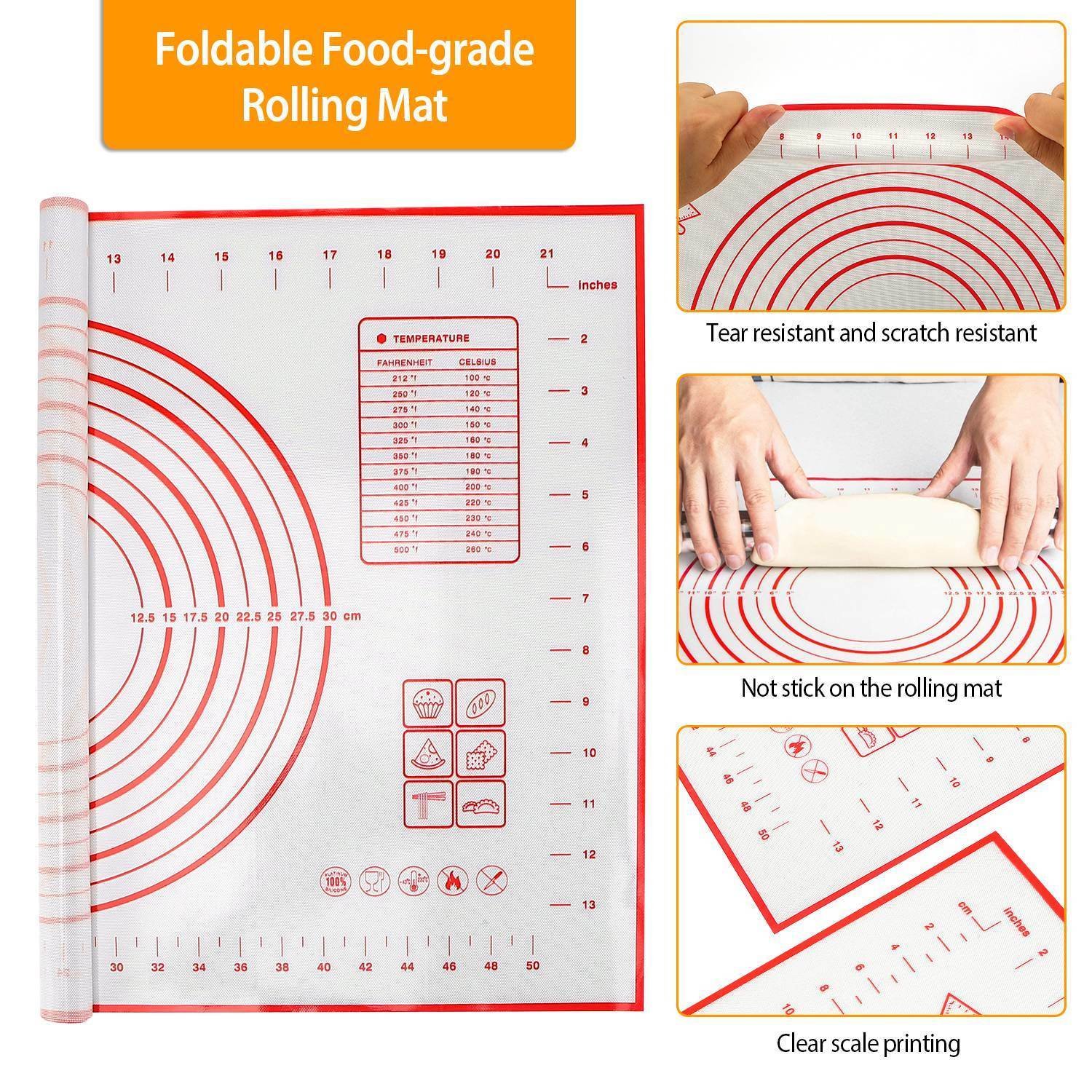 **FOOD GRADE SILICONE*:Our rolling mat is made of Food-Grade Silicone; no harm to the body; safe use for temperatures among -40℉-464℉; free of unpleasant chemical odors; providing you more time to enjoy your creations. No need to add extra flour or oil; our large nonstick sheet keeps work surfaces clean so you don’t have to spend hours scraping the dried dough off your countertops!